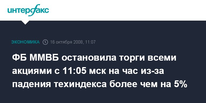 ФБ ММВБ остановила торги всеми акциями с 11:05 мск на час из-за падения техиндекса более чем на 5%