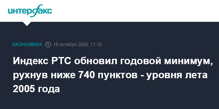 Москва. 16 октября. INTERFAX.RU - Индекс РТС, один из основных российских фондовых индикаторов, утром в четверг обновил годовой минимум, рухнув ниже 740 пунктов, что соответствует уровням лета 2005 года.