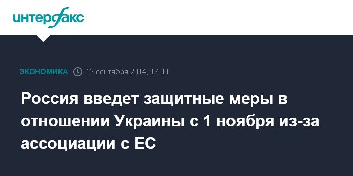 Москва. 12 сентября. INTERFAX.RU - Россия может с 1 ноября ввести защитные меры в отношении украинских товаров, если ее пожелания к соглашению Украины об ассоциации с ЕС не будут учтены, и оно будет ратифицировано в середине сентября, сообщил министр экономического развития РФ Алексей Улюкаев.