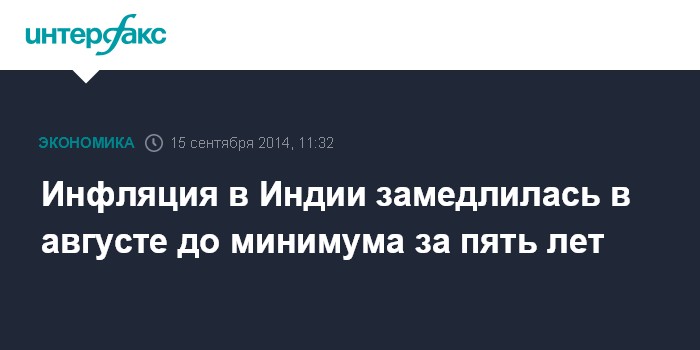 Москва. 15 сентября. INTERFAX.RU - Инфляция в Индии в августе замедлилась до минимального уровня почти за пять лет. Согласно официальным данным, индекс оптовых цен (основной показатель инфляции, используемый центробанком и правительством страны) вырос в прошлом месяце на 3,74% относительно августа 2013 года, что является самым слабым подъемом с октября 2009 года.