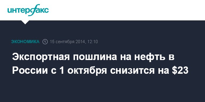 Москва. 15 сентября. INTERFAX.RU - Экспортная пошлина на нефть в России с 1 октября 2014 года снизится на $22,9 - до $344,7 за тонну, свидетельствуют расчеты "Интерфакса", основанные на данных Минфина. В настоящее время экспортная пошлина на нефть составляет $367,6 за тонну.