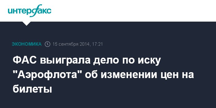 Москва. 15 сентября. INTERFAX.RU - Федеральная антимонопольная служба (ФАС) выиграла дело в арбитражном суде Москвы по иску ОАО "Аэрофлот - российские авиалинии" о признании незаконным постановления ведомства, вынуждающего авиаперевозчиков изменить ценовую политику. Об этом "Интерфаксу" заявили в ФАС.