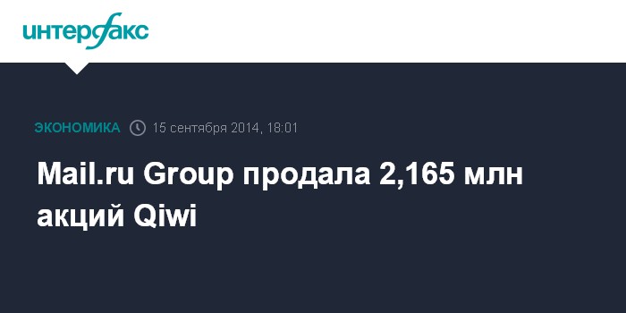 Москва. 15 сентября. INTERFAX.RU - Mail.ru Group Ltd 12 сентября продала 2,165 млн акций класса "B" компании Qiwi plc, говорится в сообщении Qiwi.