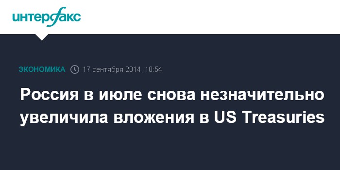 Москва. 17 сентября. INTERFAX.RU - Россия в июле увеличила вложения в казначейские облигации США (US Treasuries) на $600 млн, свидетельствуют обнародованные в ночь на среду результаты исследования американского Минфина и Федеральной резервной системы. На конец месяца показатель составлял $114,5 млрд против $113,9 млрд в июне.