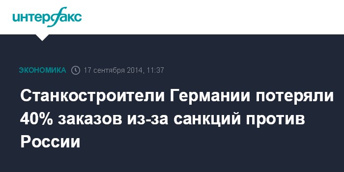 Москва. 17 сентября. INTERFAX.RU - Станкостроители Германии всерьез опасаются последствий санкционной политики Запада в отношении России, сообщает Deutsche Welle. За первое полугодие 2014 года поступление заказов сократилось на 40%.