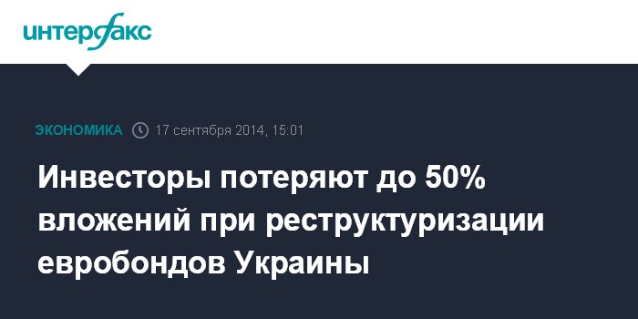 Москва. 17 сентября. INTERFAX.RU - Держатели украинских еврооблигаций могут потерять порядка 35-50% своих вложений, если Украина прибегнет к реструктуризации госдолга, считают аналитики Goldman Sachs.