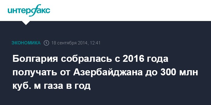 Москва. 18 сентября. INTERFAX.RU - Болгария намерена с 2016 года начать импорт азербайджанского газа в объеме 200-300 млн кубометров в год, сообщают болгарские СМИ со ссылкой на замминистра экономики и энергетики Антона Павлова.