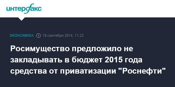 Москва. 19 сентября. INTERFAX.RU - Приватизация "Роснефти" обсуждается на 2015 год, "Аэрофлот" и "Совкомфлот" могут быть приватизированы до конца текущего года, заявила журналистам глава Росимущества Ольга Дергунова.