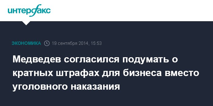 Москва. 19 сентября. INTERFAX.RU - Премьер-министр Дмитрий Медведев готов рассмотреть возможность введения кратных штрафов для предпринимателей вместо уголовного наказания по аналогии с механизмом, действующим для чиновников.