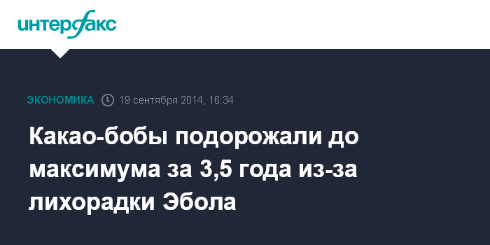 Москва. 19 сентября. INTERFAX.RU - Фьючерсы на какао-бобы подорожали до максимального уровня за три года на опасениях, что распространение вируса лихорадки Эбола в Африке может привести к сокращению поставок этого сырья, сообщает агентство Bloomberg.