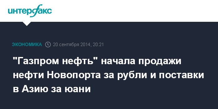 Москва. 20 сентября. INTERFAX.RU - "Газпром нефть" начала продажи нефти Новопортовского месторождения за рубли и поставляет нефть в Азию за юани, сообщил в интервью телеканалу "Россия 24" глава "Газпром нефти" Александр Дюков.