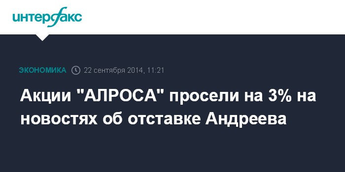 Москва. 22 сентября. INTERFAX.RU - Акции корпорации "АЛРОСА" утром в понедельник просели на 3% на новостях, что президент АК Федор Андреев принял решение оставить свой пост.