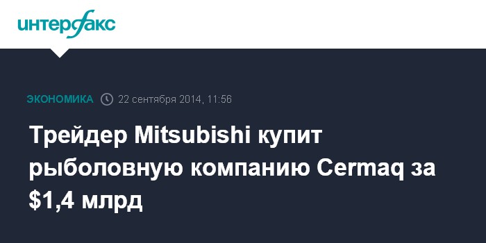 Москва. 22 сентября. INTERFAX.RU - Крупнейший торговый дом Японии Mitsubishi сделал предложение о покупке норвежской рыболовной компании Cermaq за 8,88 млрд норвежских крон ($1,4 млрд) в рамках стратегии, направленной на расширение продовольственного бизнеса.