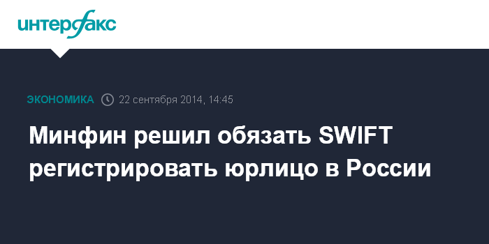 Москва. 22 сентября. INTERFAX.RU – Минфин РФ хочет обязать "операторов значимой инфраструктуры", к которым может быть отнесена система SWIFT, регистрировать юридическое лицо в России, сообщил журналистам замминистра финансов Алексей Моисеев.