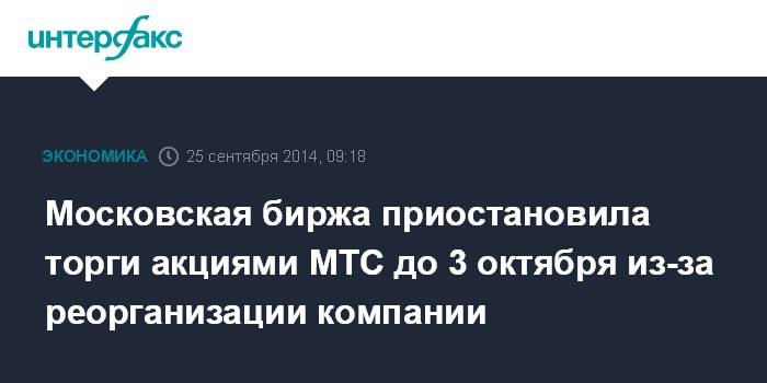 Москва. 25 сентября. INTERFAX.RU - Московская биржа в четверг приостановила все сделки с акциями ОАО "Мобильные Телесистемы" (МТС).