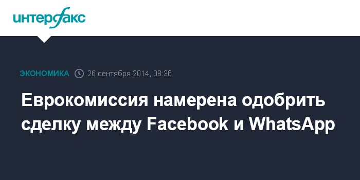 Москва. 26 сентября. INTERFAX.RU - Европейская комиссия склоняется к одобрению сделки крупнейшей социальной сети мира Facebook по покупке сервиса обмена сообщениями WhatsApp за $19 млрд, пишет The Wall Street Journal со ссылкой на информированные источники.