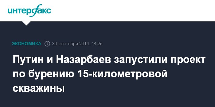 Москва. 30 сентября. INTERFAX.RU - Президенты России и Казахстана во вторник с помощью символических ключей запустили совместный проект "Евразия", в рамках которого планируется осуществить бурение сверхглубокой скважины.
