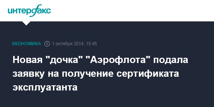 Москва. 1 октября. INTERFAX.RU - ООО "Бюджетный перевозчик" (100%-ная "дочка" "Аэрофлота") подало в Федеральное агентство воздушного транспорта (Росавиация) заявку на получение сертификата эксплуатанта, сообщили "Интерфаксу" в "Аэрофлоте". В Росавиации пока не стали комментировать наличие заявки.