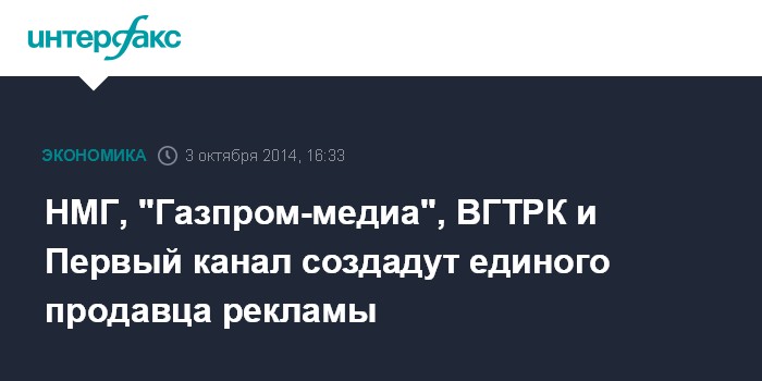 Москва. 3 октября. INTERFAX.RU - Медиахолдинги "Национальная медиа группа", "Газпром-медиа холдинг", ВГТРК и "Первый канал" договорились о создании на паритетных началах компании, которая будет реализовывать их рекламные возможности.