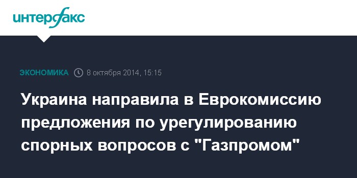 Москва. 8 октября. INTERFAX.RU - Украина направила в Еврокомиссию свои предложения по разрешению газового конфликта с российским "Газпромом", а также варианты погашения существующей задолженности за уже потребленный газ.