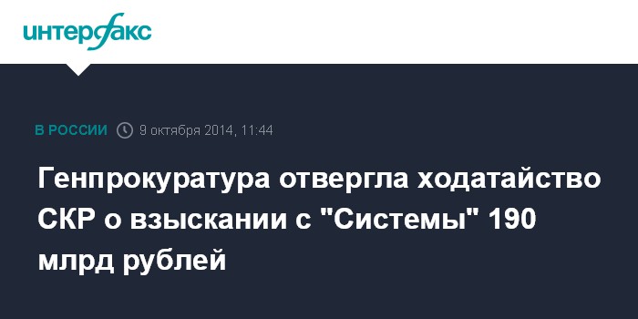 Генпрокуратура отвергла ходатайство СКР о взыскании с "Системы" 190 млрд рублей