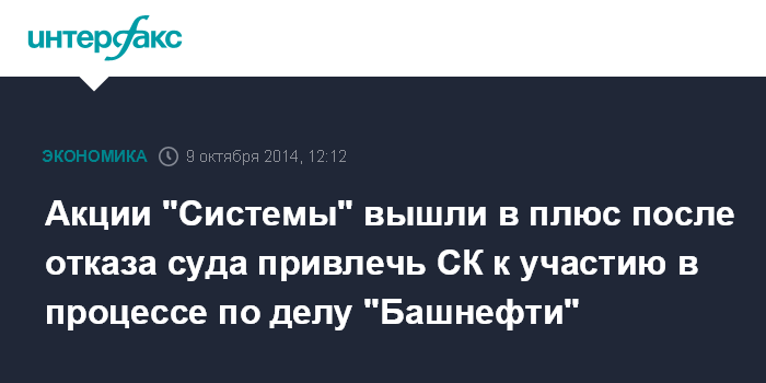 Москва. 9 октября. INTERFAX.RU - Акции АФК "Система" вышли в плюс после известий об отказе Арбитражного суда Москвы привлечь Следственный комитет к участию в процессе по делу "Башнефти".