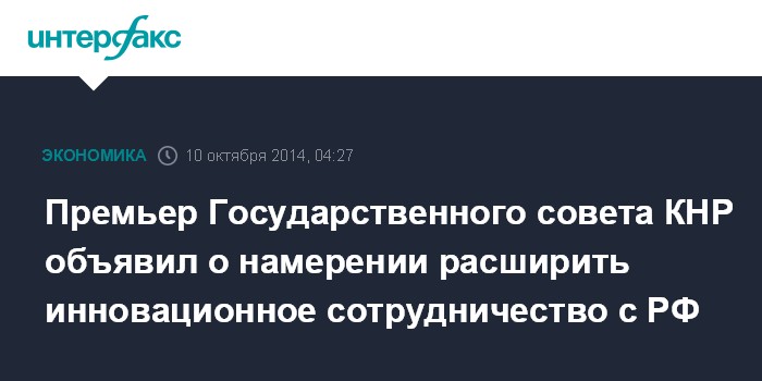 Москва. 10 октября. INTERFAX.RU - Премьер Государственного совета КНР Ли Кэцян считает, что необходимо значительно увеличить в двустороннем сотрудничестве РФ и КНР удельный вес научно-технической инновации с использованием возможностей инновационного сотрудничества.