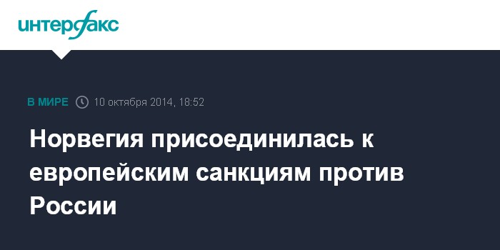 Москва. 10 октября. INTERFAX.RU - Власти Норвегии приняли решение присоединиться к последним санкциям ЕС против России, введенным 12 сентября, в связи с ситуацией на Украине, говорится в пресс-релизе МИД Норвегии, размещенном на сайте ведомства.