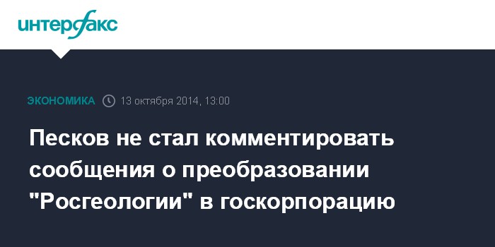 Москва. 13 октября. INTERFAX.RU - Пресс-секретарь президента России Дмитрий Песков не подтвердил, но и не опроверг информацию о том, что Владимир Путин одобрил преобразование "Росгеологии" в госкорпорацию. Соответствующую информацию опубликовал ранее РБК.