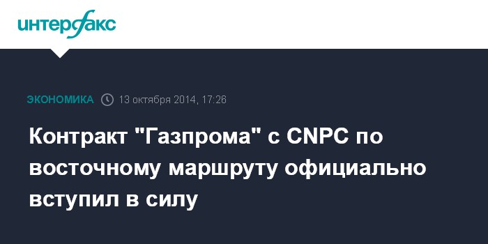 Москва. 13 октября. INTERFAX.RU - Контракт "Газпрома" с CNPC по восточному маршруту официально вступил в силу в момент подписания межправсоглашения, сообщил глава "Газпрома" Алексей Миллер журналистам. "С этого момента начинается отчет времени до начала поставок", - сказал глава "Газпрома".