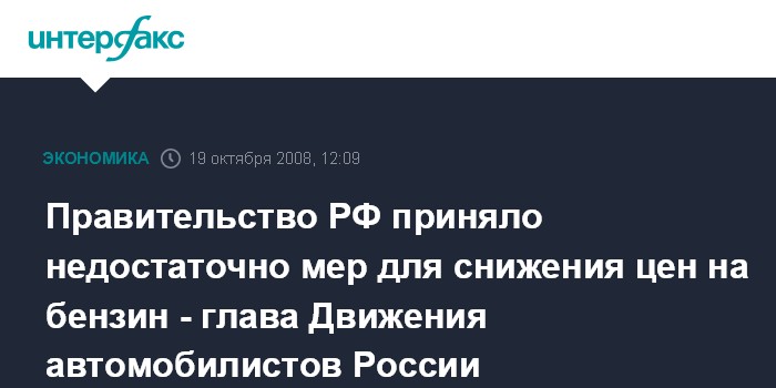 Москва. 19 октября. INTERFAX.RU - Правительство РФ приняло недостаточно мер для снижения цен на бензин, а производители и продавцы топлива продолжают получать сверхприбыли, считает председатель общероссийского общественного движения "Движение автомобилистов России" Виктор Похмелкин.