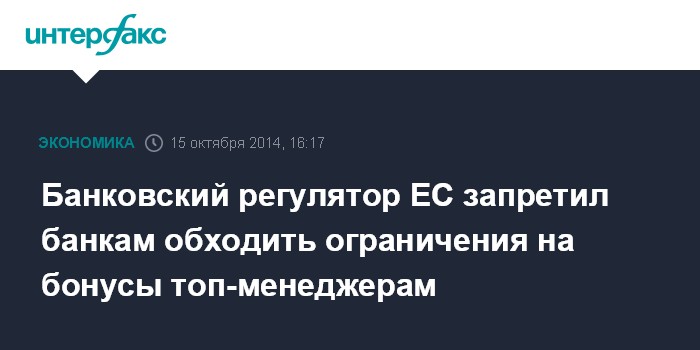 Москва. 15 октября. INTERFAX.RU - Европейское банковское управление (EBA), ведущий банковский регулятор Евросоюза, лишил крупнейшие финкомпании Европы возможности обойти ограничения на бонусы для топ-менеджеров путем выплаты отдельных ежемесячных денежных пособий, сообщает агентство Bloomberg.