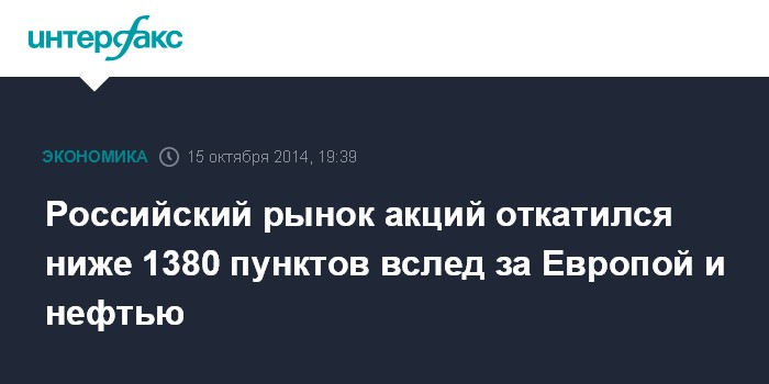 Москва. 15 октября. INTERFAX.RU - Российский рынок акций в среду опустился ниже 1380 пунктов по индексу ММВБ вслед за обвалом в Европе и подешевевшей накануне нефтью, хотя последняя в среду наметила отскок на фоне падения доллара после выхода в США слабой статистики.