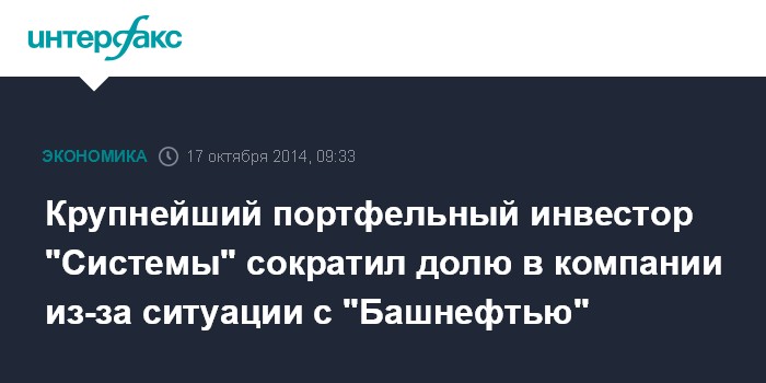 Крупнейший портфельный инвестор "Системы" сократил долю в компании из-за ситуации с "Башнефтью"