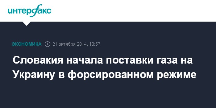 Москва. 21 октября. INTERFAX.RU - Поставки газа на Украину со стороны Словакии 20 октября достигли рекордного значения в объеме 27,6 млн кубометров в сутки, сообщили "Интерфаксу" в пресс-службе ПАО "Укртрансгаз" во вторник. "Поставки осуществляются в форсированном режиме. Все работает надежно, никаких внештатных ситуаций нет", - отметил представитель пресс-службы.