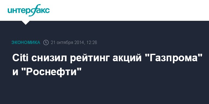 Москва. 21 октября. INTERFAX.RU - Citi пересмотрел прогнозные цены акций и глобальных депозитарных расписок (GDR) анализируемых нефтегазовых компаний РФ, сообщается в обзоре инвестбанка. По итогам переоценки, для акций "Газпрома" была понижена рекомендация с "покупать" до "продавать", а для акций "Роснефти" - с "покупать" до "держать".