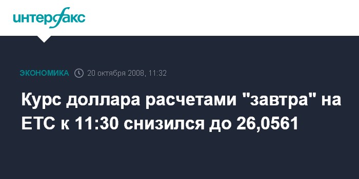Москва. 20 октября. INTERFAX.RU – Средневзвешенный курс доллара расчетами "завтра" на единой торговой сессии (ЕТС) ММВБ в понедельник снизился на 19,44 копейки по сравнению с уровнем, сформировавшемся к этому времени накануне, и составил 26,0561 руб./$1.
