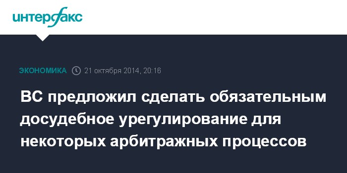Москва. 21 октября. INTERFAX.RU - Верховный суд постановил внести в Госдуму законопроект, которым предлагается сделать обязательной процедуру досудебного урегулирования в некоторых категориях арбитражных процессов. В Верховном суде рассчитывают, что это поможет существенно снизить нагрузку на суды первой инстанции.