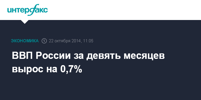 Москва. 22 октября. INTERFAX.RU - ВВП России, по оценке Минэкономразвития, за январь-сентябрь 2014 года вырос на 0,7% по сравнению с аналогичным периодом 2013 года, заявил журналистам министр экономического развития России Алексей Улюкаев.