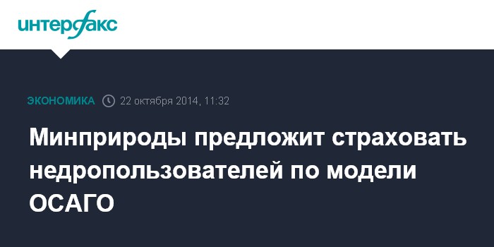 Москва. 22 октября. INTERFAX.RU - Минприроды России предложит модель страхования недропользователей по аналогии с ОСАГО, сообщил "Интерфаксу" замминистра природных ресурсов Денис Храмов.