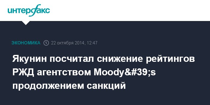 Москва. 22 октября. INTERFAX.RU - Президент РЖД Владимир Якунин считает снижение рейтингов компании агентством Moody's продолжением санкций.