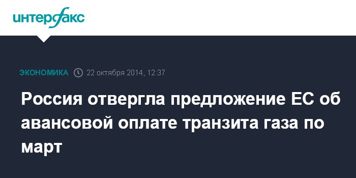 Москва. 22 октября. INTERFAX.RU - Еврокомиссия предложила "Газпрому" заплатить авансом за транзит газа через Украину по март включительно, но Россия не согласна с этим предложением, так как считает это очередным кредитованием, сообщил министр энергетики Александр Новак журналистам.