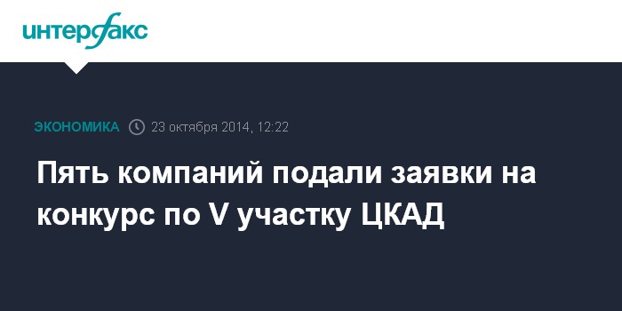 Москва. 23 октября. INTERFAX.RU - ОАО "Мостотрест", ООО "Стройгазконсалтинг" (СГК), ЗАО "Крокус Интернэшнл" (входит в Crocus Group Араса Агаларова), ООО "Кольцевая магистраль" и ОАО "ДСК "Автобан" подали заявки на конкурс по строительству, содержанию, ремонту и капитальному ремонту пятого пускового комплекса Центральной кольцевой автомобильной дороги (ЦКАД), сообщил корреспондент "Интерфакса" с процедуры вскрытия конвертов с заявками.