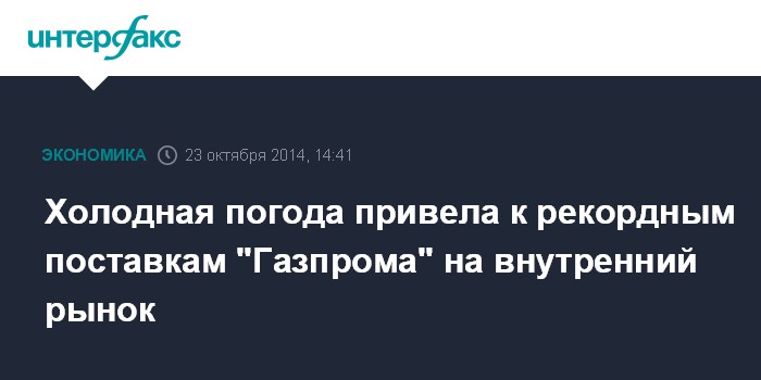 Москва. 23 октября. INTERFAX.RU - Единая система газоснабжения 21 октября поставила отечественным потребителям 1,128 млрд куб. м газа - рекордный объем для середины октября, говорится в сообщении "Газпрома".