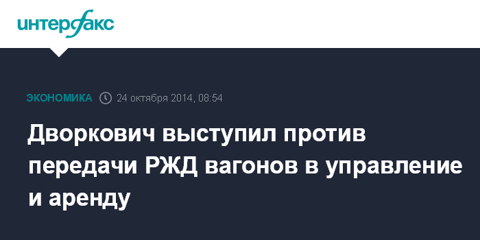 Москва. 24 октября. INTERFAX.RU - Вице-премьер РФ Аркадий Дворкович выступил против передачи ОАО "Российские железные дороги" вагонов в управление и аренду, пишут в пятницу "Ведомости" со ссылкой на протокол заседания межведомственной рабочей группы по вопросам развития железнодорожного транспорта от 2 октября.