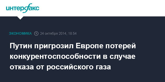 Москва. 24 октября. INTERFAX.RU - Президент РФ Владимир Путин считает, что отказ европейских стран от поставок российских энергоносителей нанесет большой ущерб конкурентоспособности европейской экономики.