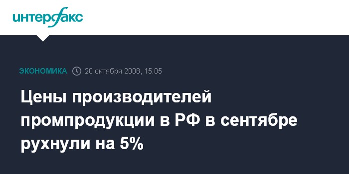 Москва. 20 октября. INTERFAX.RU - Цены производителей промышленной продукции в России в сентябре 2008 года упали на 5% после повышения на 0,5% в августе, 5,4% в июле и 4,9% в июне, сообщила в понедельник Федеральная служба государственной статистики (Росстат). Это максимальное падение промышленных цен за месяц за всю современную российскую историю.