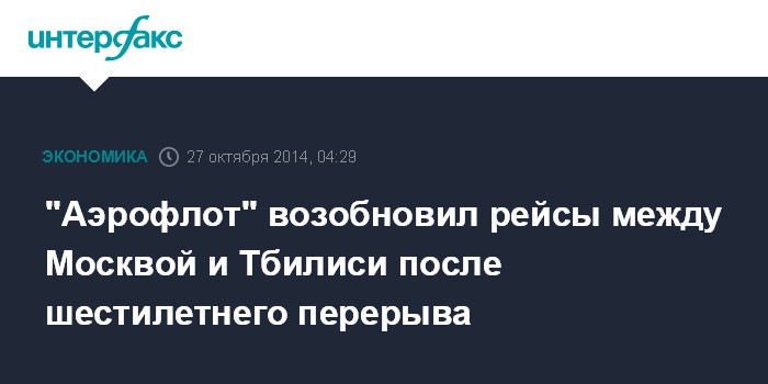 Москва. 27 октября. INTERFAX.RU - Российская авиакомпания "Аэрофлот" в ночь на понедельник выполнила первый после шестилетнего перерыва прямой рейс из Москвы в Тбилиси, возобновив регулярное авиасообщение между столицами двух стран.