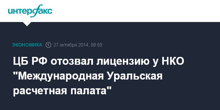 Москва. 27 октября. INTERFAX.RU - ЦБ РФ отозвал лицензию на осуществление банковских операций у небанковской кредитной организации "Международная Уральская расчетная палата", зарегистрированной в Москве, говорится в сообщении ЦБ.