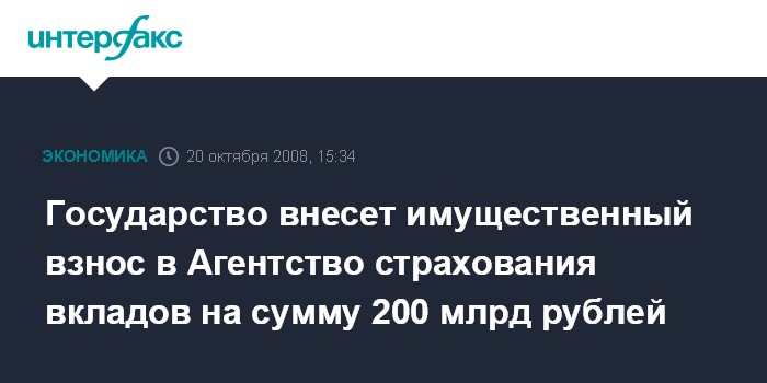 Государство внесет имущественный взнос в Агентство страхования вкладов на сумму 200 млрд рублей